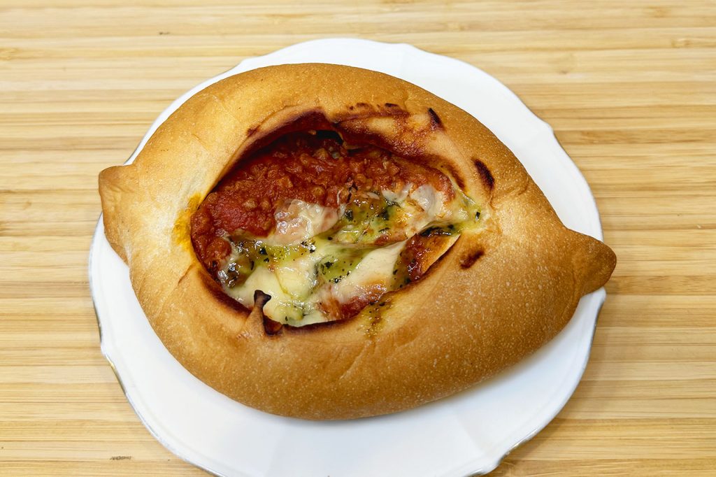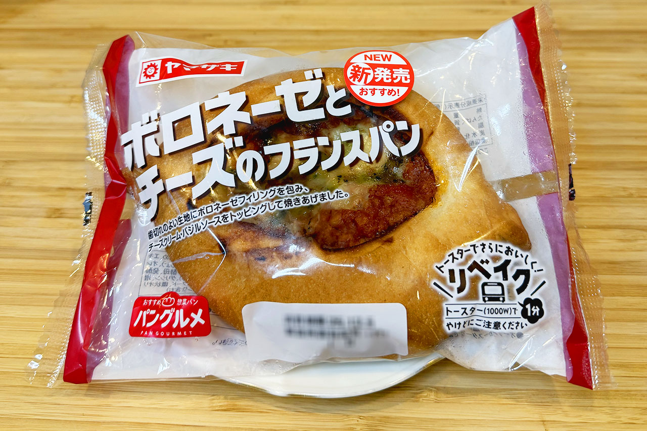 いただきます!。。。お、ボロネーゼのトマトソースの塩気が少しケミカルに感じます。見かけ通りのピザパンなんですが、フランスパン部分が、あと少し。ベーカリーで売っているようなフランスパンの噛みごたえはなくちょっと硬めのパンの耳のよう。温めるとサクサクする。期待としてはベーコンエピみたいなフランスパンになって欲しいところです。パン自体にも甘味はあんまりなく塩気が優勢。