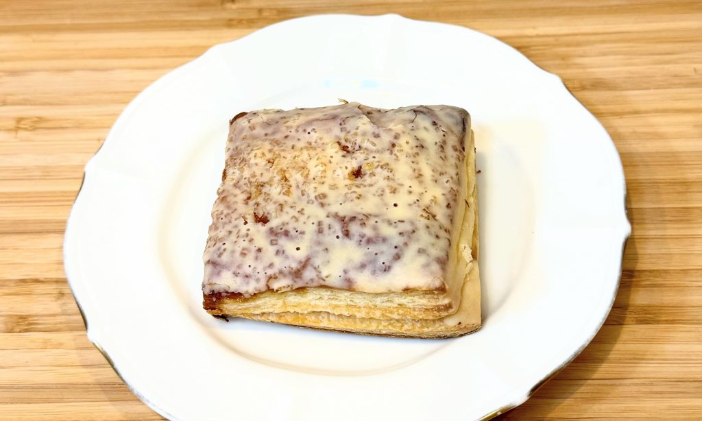 パイ生地にカスタードクリームを包み、表面にカラメルシロップとザラメをトッピングして焼き上げ、バニラ風味のグレーズをかけました。