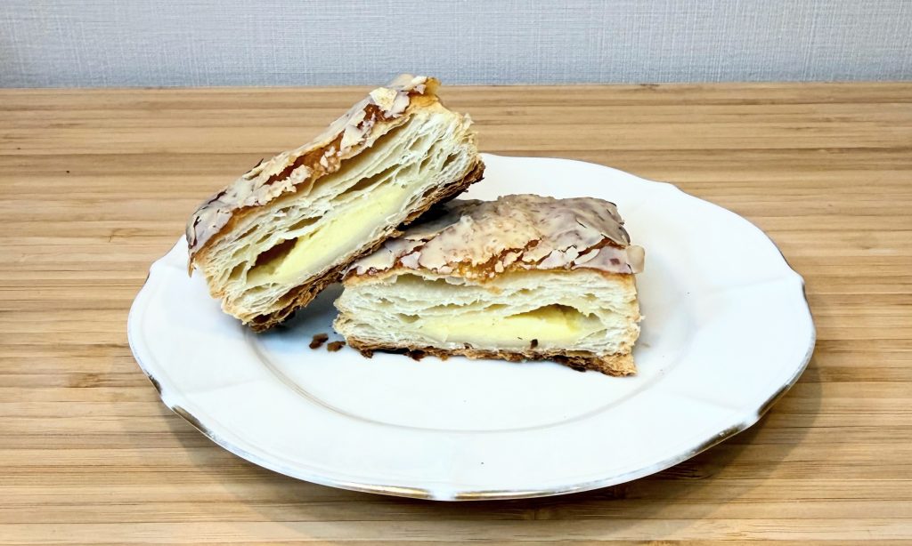 生地の層がとても細かくてきれい!さすがパスコさんの繊細な仕事ぶりです。切った時サクッとはしなくてパイなんですがデニッシュの方が近いかな。