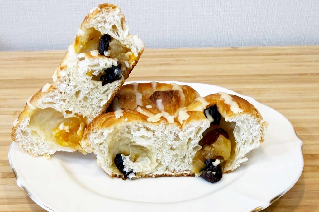 ふんわりしっとりとしたデニッシュ生地でりんごプレザーブ・洋酒漬レーズン・オレンジピールを包んで焼き上げ、バニラ風味のグレーズをかけました。