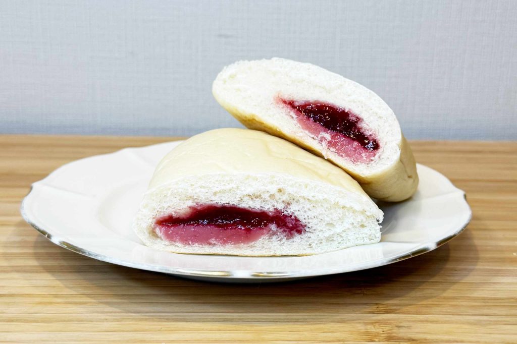 白パン生地は塩気がありイーストの酸味がある。ジャムと一緒なら気にならない程度です。モチモチさはなくて、普通のジャムパンのパンに近い軽い感じです。
