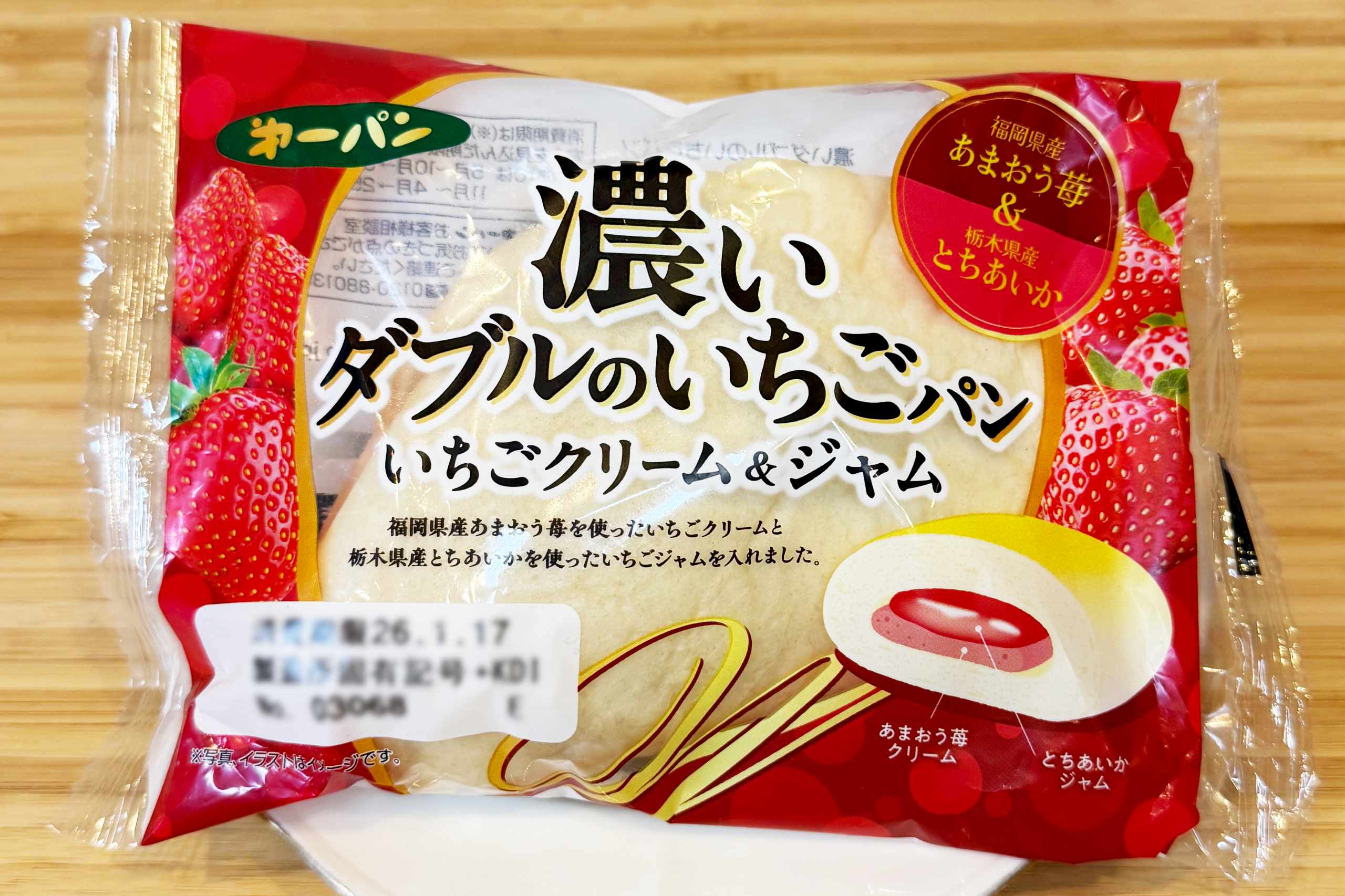 なんとダブルのいちごパンですって!ダブルなのは ジャムとクリームだけではありません、いちごも2種類使われています!豪華すぎます。第一パンのロゴマークも心なしかいつもより輝いて見えます。