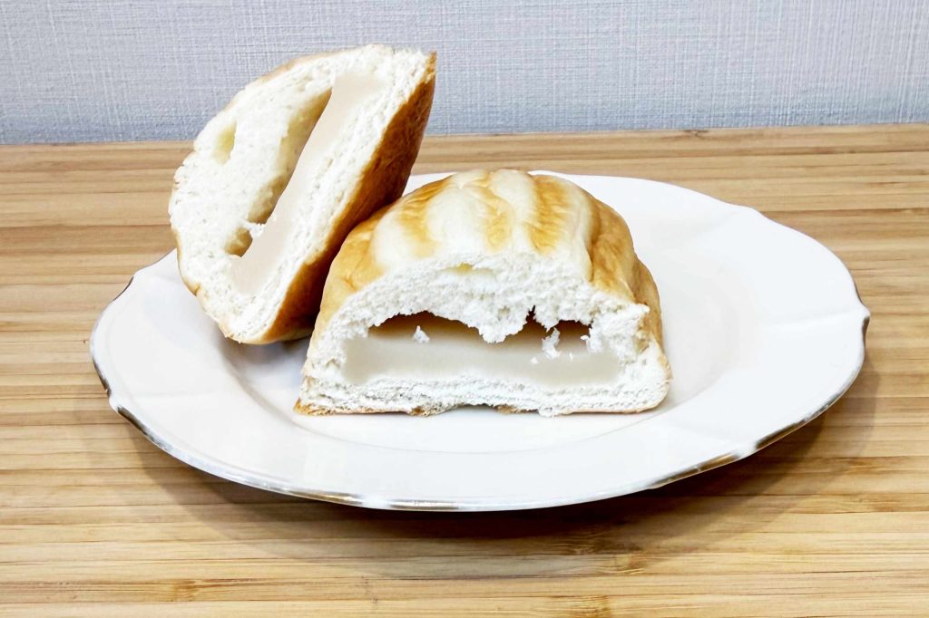 カットしてみると、白あんがかなりたっぷり。他の袋パンに比べてフィリング量がかなり多くて、これぞ西日本のメロンパン!