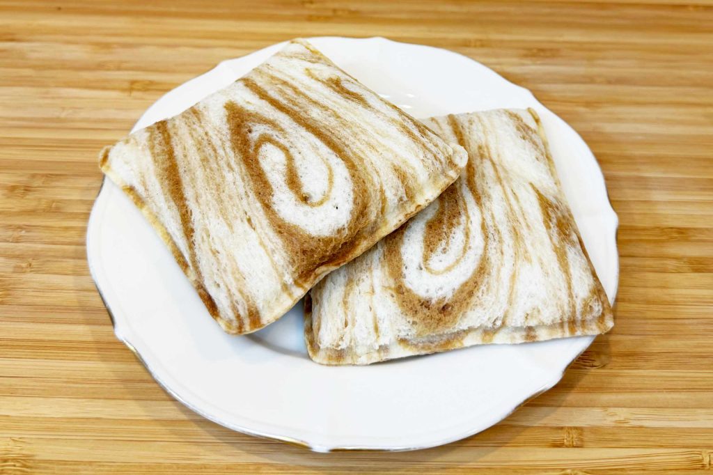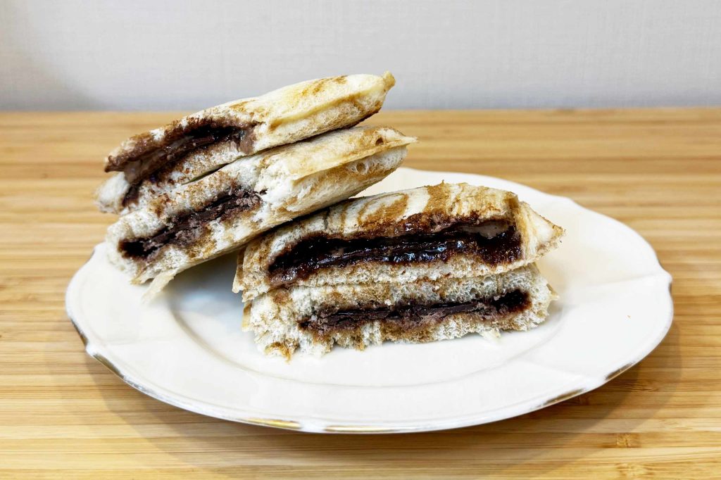 温めて食べると(板ガムのような)板チョコがとろりと溶け出して完全にクリーム化。ちょっと良さを減らしてしまったかも!一方でパンはサクサクになって美味しいよ。