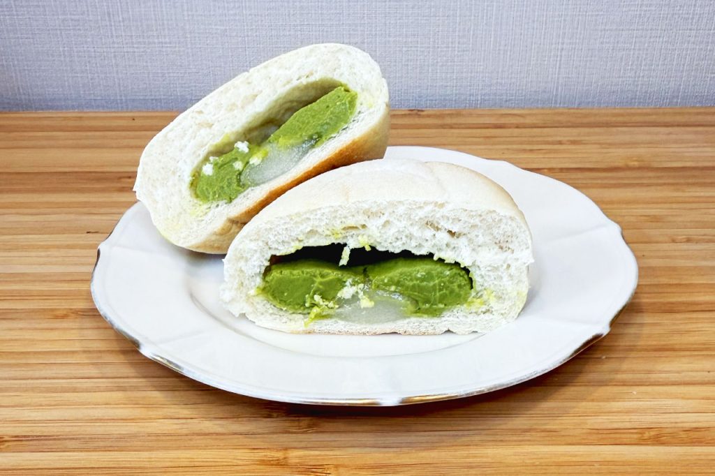 抹茶クリームの味がかなり自然で、香料や作り物の味ではない。かじるときにちょっとだけアルコールの匂いがあるんだけど、パンなのかな。抹茶の方ではないと思います。それがなかったらもっと良かったけど、基本的にはしっかりおいしい。