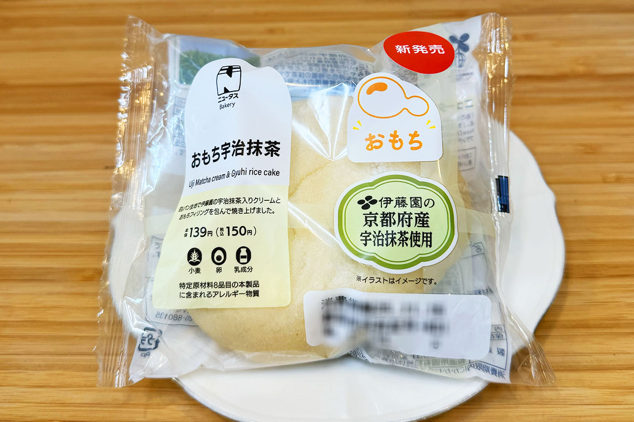 NewDaysはもちもちした白パン商品のラインアップが豊富なイメージがあり、その流れでこちらも購入してみました。抹茶×おもちって外国人観光客に王道人気の組み合わせ、、。人気ということは食べてみないわけにはいかないでしょう。パン自体は至ってシンプルな外見ですが、外袋におもちのイラストや抹茶の強調があり、目を引くパッケージ。