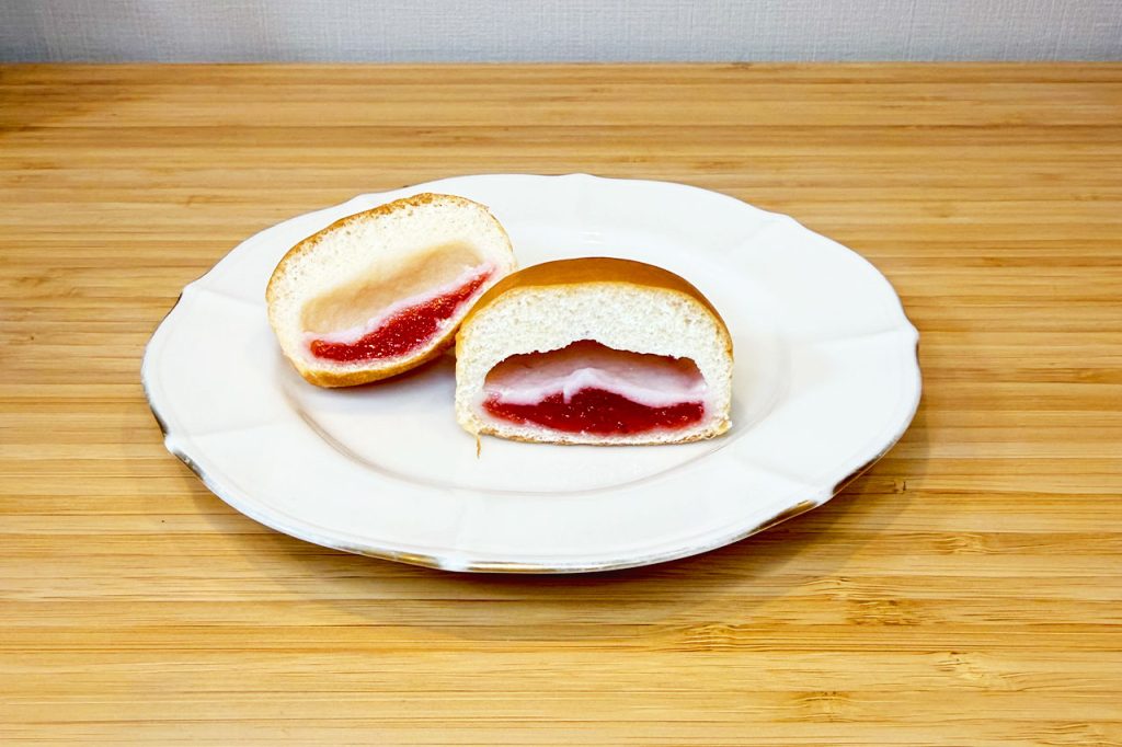 わぁ〜綺麗な断面です。切った感じはゼリーに近い苺ジャム。結構空洞が大きいように感じるんですが、パンを手作りされる人から見たら、この空洞は技術というか、綺麗な空洞という表現を聞いたことがあります。