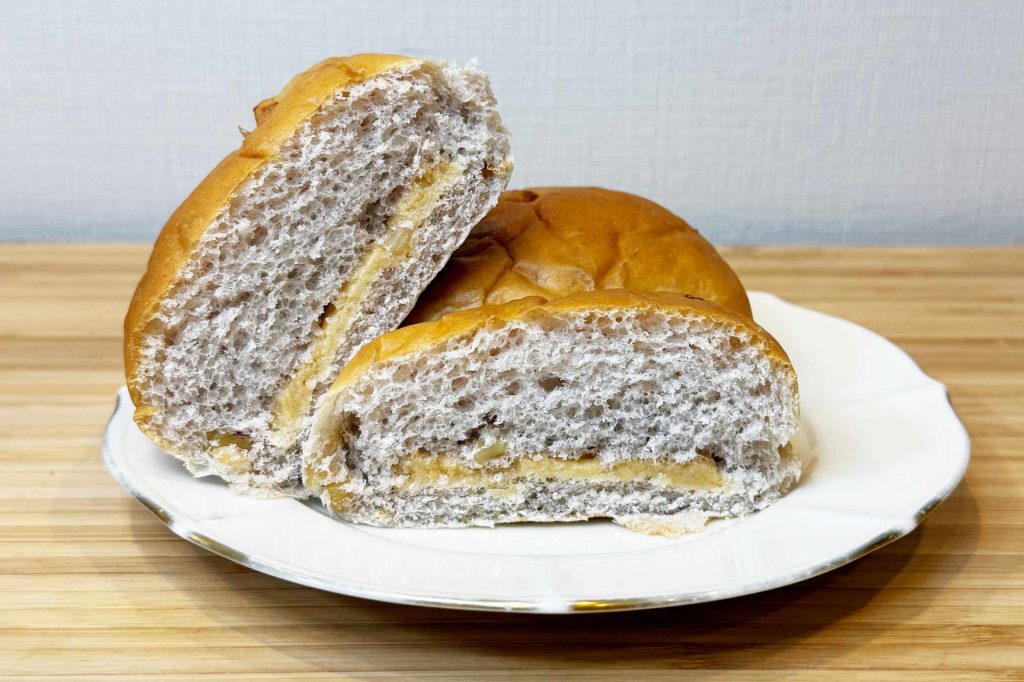 きれいな断面ですね。くるみパンってどの商品も薄紫色の生地ですが、こちらのくるみアーモンドパンも同じように色づいています。調べてみたのですが、胡桃の皮に含まれるポリフェノールがパン生地に練り込むときに浸透して色付くそうです。なるほど、十分な量のくるみをしっかり練り込まれているってことか。この色がヘルシーで食べたい気持ちをそそるんですよね。